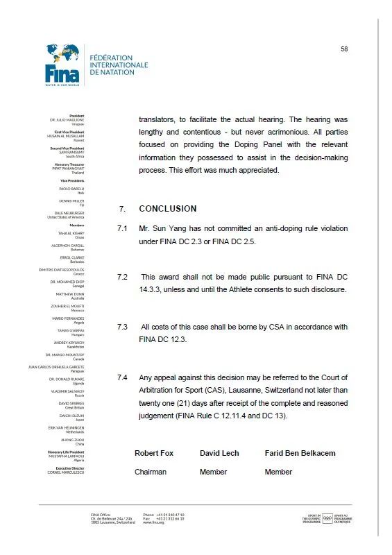 国际泳联59页裁决报告结论部分