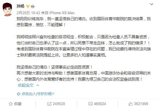 中国泳协在2月28日也发表声明称,我们支持孙杨继续以法律手段维护自己的合法权益。同时希望世界反兴奋剂机构、体育组织、兴奋剂检查代理机构改进、完善规则,严格执行规则包括兴奋剂检查人员资证要求,不能忽视运动员个人合法权利,不能让任何人都可以去从事与运动员切身利益密切相关的兴奋剂检查工作。
