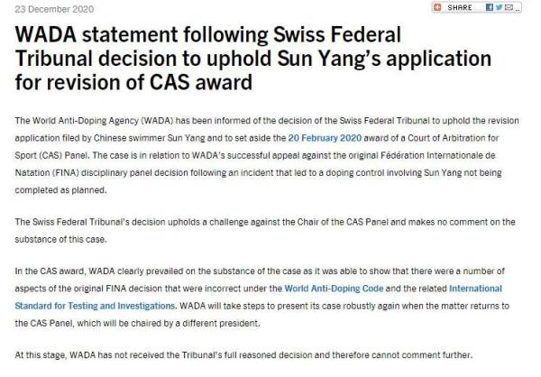 据wada网站当地时间23日发布的消息,其已获悉瑞士联邦法庭决定支持中国游泳运动员孙杨改判申请,并撤销cas(国际体育仲裁法庭)小组在今年2月对其作出的禁赛裁决。