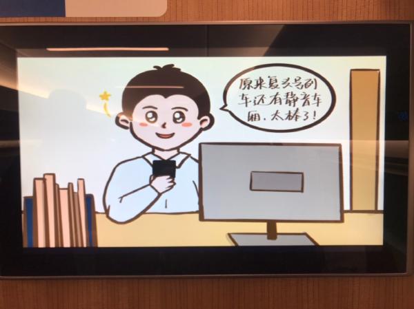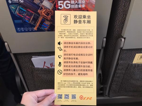 进入车厢后,记者就看到两端的墙上,以及车厢门玻璃内外两侧都张贴了“静音车厢”标识;每个座位网兜后也摆放了“服务提示卡”,告知旅客“静音约定”;此外,两端的车载视频系统默认静音,并循环播放关于“静音车厢”的宣传片。