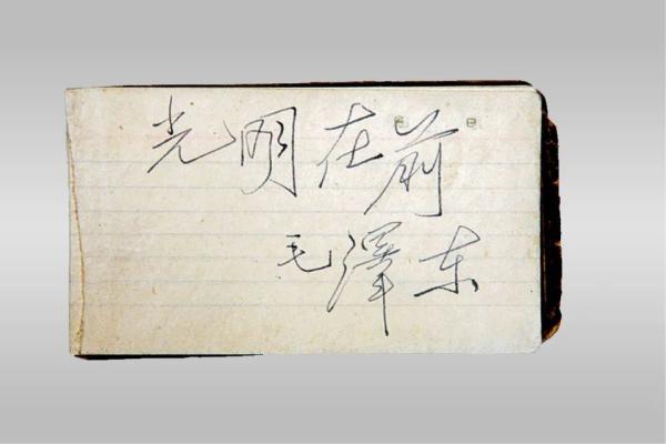 据军事博物馆官网报道,1947年3月,党中央撤离延安,开始转战陕北,指挥全国解放战争。任远志当时正在延安中学就读,住在王家湾,亲眼目睹了毛泽东、周恩来、任弼时等老一辈革命家不分昼夜,辛勤工作的情景。在撤离王家湾时,她向毛泽东辞行,请毛泽东题字,毛泽东欣然在她的小本子上写下“光明在前”四个字。1959年,由任远志捐赠军事博物馆。