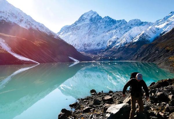 一名徒步者走过新西兰库克山国家公园的湖泊 郭磊/摄