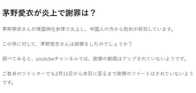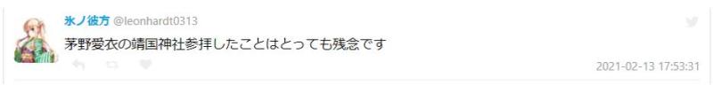 11日,就在中国民众喜迎牛年的除夕夜,茅野爱衣在其常驻广播节目《工作之余祈愿》(第152回)中自曝当日参拜了靖国神社。她说,工作地点就在靖国神社附近,因为还有些时间,就去参拜了靖国神社。