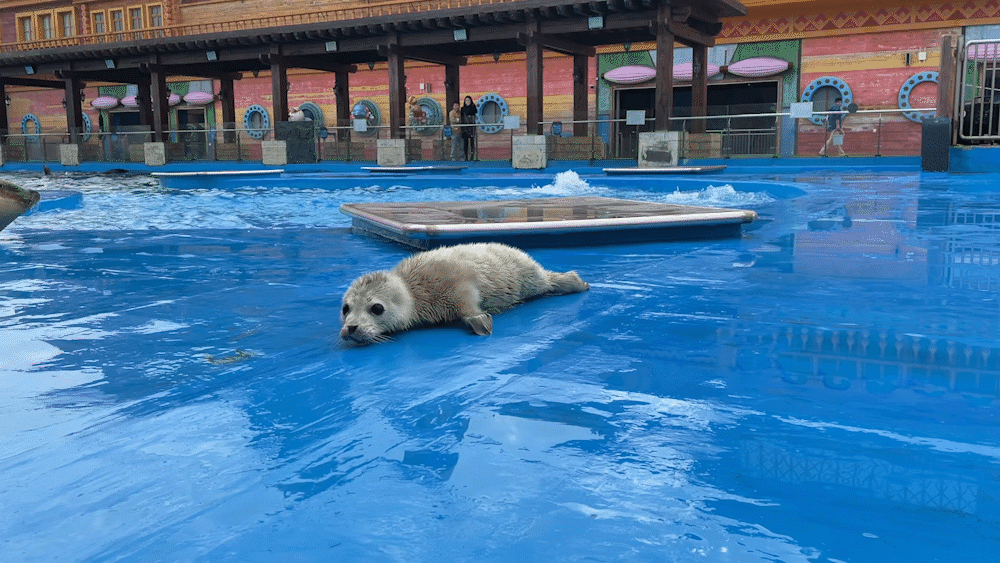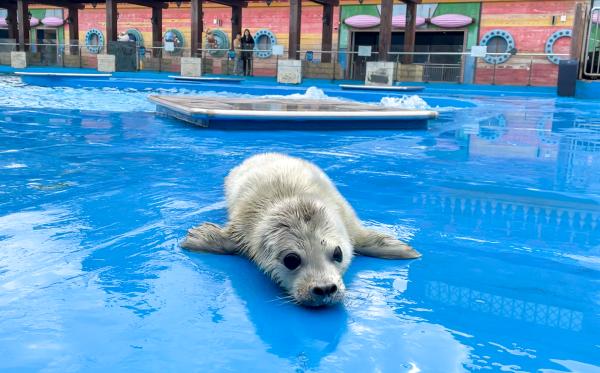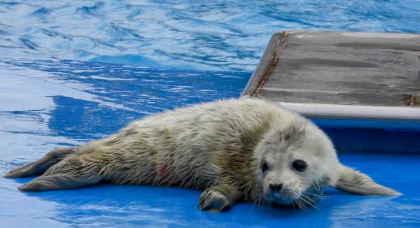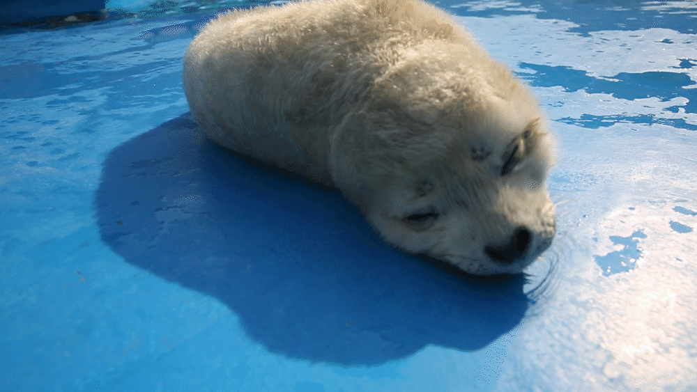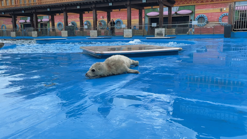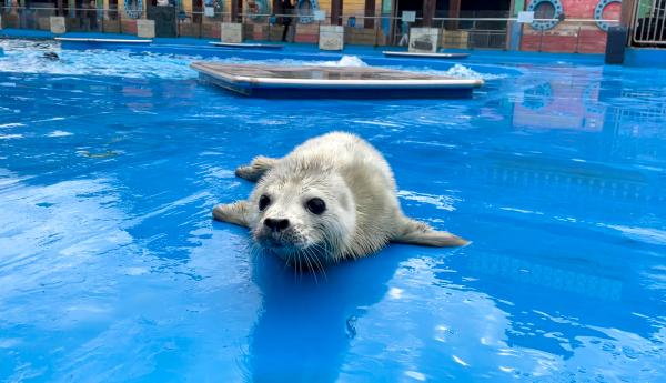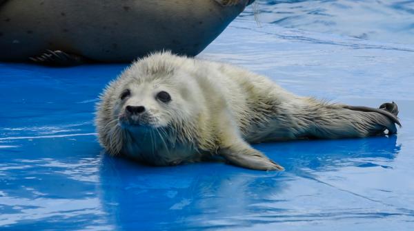 这只新生的海豹宝宝是只雄性海豹,性格活泼温顺,在吃母乳三至四周后饮食上会转成饵料,经历换毛期后便能独立下水生活。