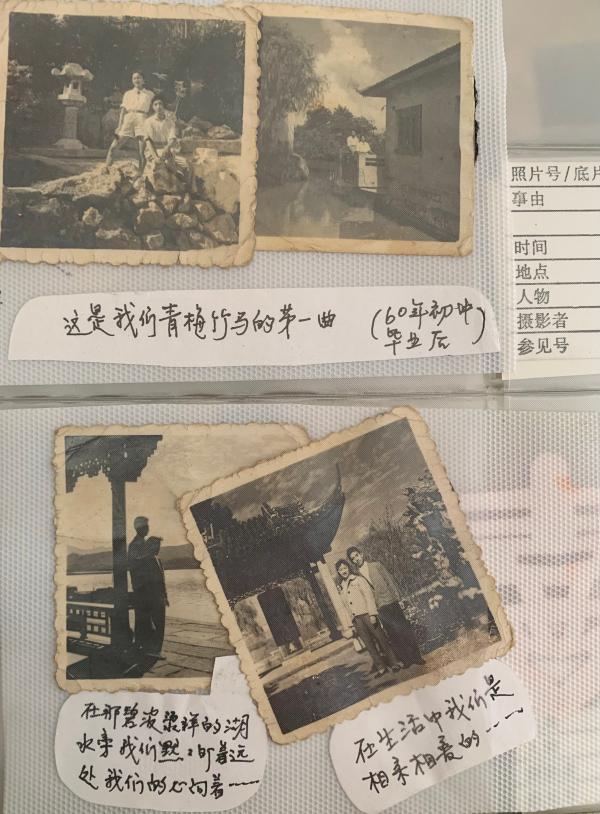 “1956年,苏联军舰首次造访上海,我代表上海少年儿童去吴淞口迎接,穿着新裙子。”“1960年,初中毕业,这是我们青梅竹马的第一曲。”“1962年,在杭州度蜜月,虽然天气阴沉沉的,我们心里却充满阳光。”“1970年元旦,小女儿晓琪来到我们家,一家五口开始了新的生活。”……