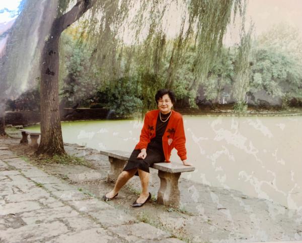 有一天老两口去金桥公园散步,走在路上,女儿的同事拍下一张他们手牵手的背影,她也很喜欢——老伴穿着蓝马甲,她则是红毛衣,路边粉色的木槿花很茂盛。“我们出门总是手拉着手,大家都说是道风景线。”