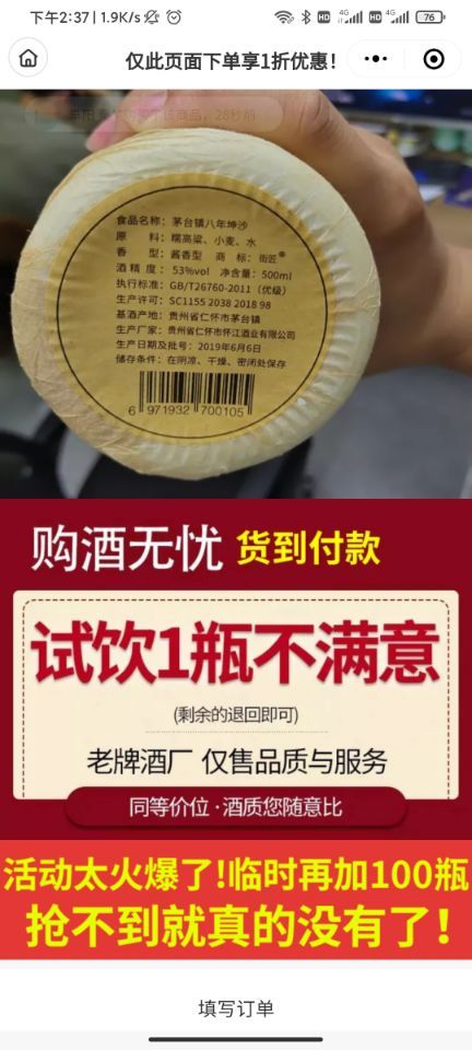 老张很好奇,1折清仓甩卖的这10万瓶茅台镇八年坤沙老酒,到底是什么酒?点击广告链接,跳转至购买页面,上面也有详细的介绍:“茅台镇53度酱香酒,100%纯粮酿造”“封存了8年的坤沙酱香老酒”“任何不满意终身包退”“若是假酒不用退,直接倒,我们百倍退款”。