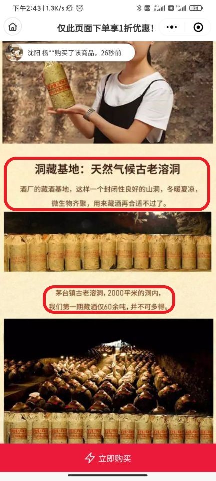 卖家还宣称,这款酒产自中国第一酒镇——茅台镇,先窖藏了几年后,又洞藏在了古老的溶洞里,口感更加绵柔;“稍微包装好点,市面上起码要150元一瓶,甚至300~400元一瓶”,现在统统1折清仓。