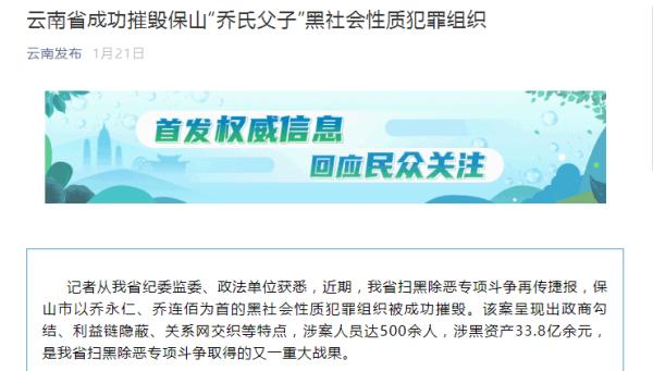 此前,据“云南发布”微信公众号1月21日消息,云南省成功打掉了盘踞在保山三十余年的以乔永仁、乔连佰为首的黑社会性质组织违法犯罪团伙。该案呈现出政商勾结、利益链隐蔽、关系网交织等特点,涉案人员达500余人,涉黑资产33.8亿余元,是云南省扫黑除恶专项斗争取得的又一重大战果。