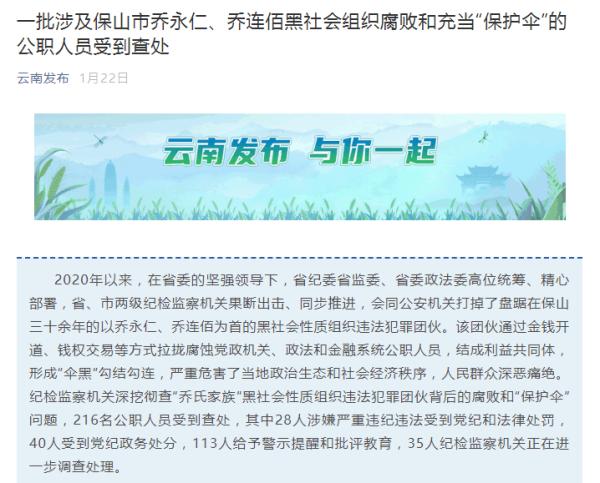 1月22日,“云南发布”微信公众号发布《一批涉及保山市乔永仁、乔连佰黑社会组织腐败和充当“保护伞”的公职人员受到查处》文章,披露了保山市原市长吴松、市人大常委会原主任杨建洪、市住建局原副局长朱剑平等人被盘踞保山三十多年的“乔氏家族”拉拢腐蚀的情节。