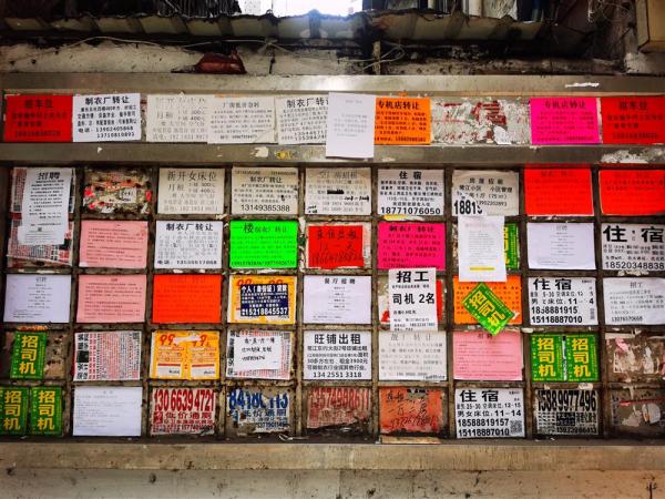 制衣村的信息栏中,转让制衣厂的广告和招工的广告数量不相上下。