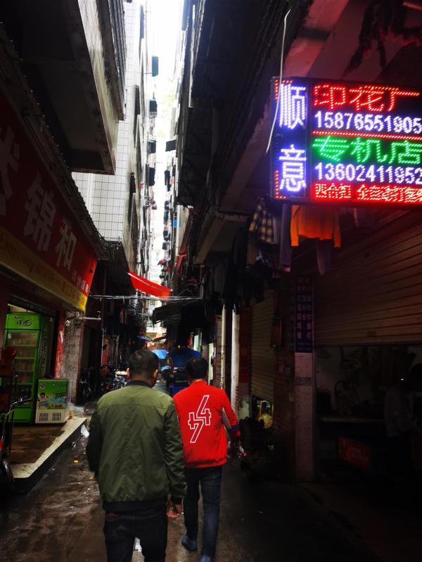 而紧邻中大布匹市场的五凤村、康乐村和鹭江村,则因城中村低廉的房租和城市管理的空白,吸引了大量外来务工者,并发展出一条完整的制衣产业链——客户前脚在布匹市场订购面料,后脚就到制衣村里的工厂下单,裁剪、缝制、熨烫、印花、贴钻,快则当日就能完工,慢也不过三五天工时。服装出厂后,经由十三行、沙河等批发市场,销往全国各地。