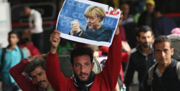 2015年9月5日,德国慕尼黑,来自叙利亚的难民手举默克尔画像。