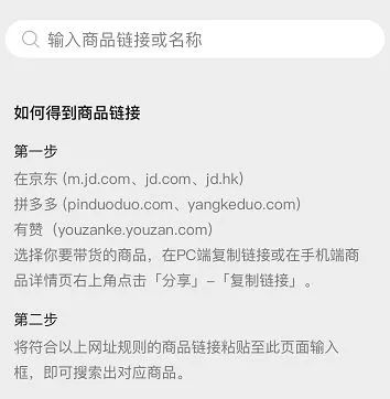 另一方面,如果不想使用商店小助手,用户只需要把平台(京东、有赞和拼多多)上的商品链接复制或分享到商品橱窗里,就可以找到对应商品进行带货。