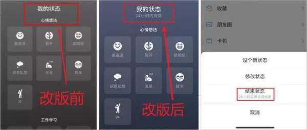 微信“状态”功能刚上线的时候,没有标明状态在 24 小时后会自动失效,因此当时不少用户产生了“为什么我的微信状态没了”这样的疑问。这次改版后的微信状态页面,新增了“24小时内有效”字样。