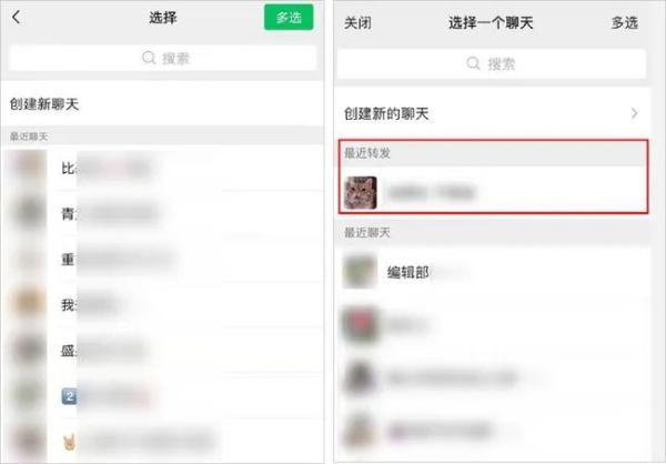 这次改版后,微信在好友选择界面新增了“最近转发”选项。用户更新版本后再转发内容时,就可以根据“最近转发”,快速找到想要转发的好友。