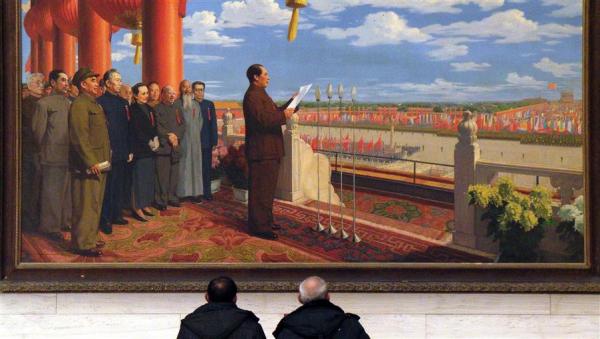 图为观众在中国国家博物馆观赏画家董希文的油画作品《开国大典》。(新华社发)