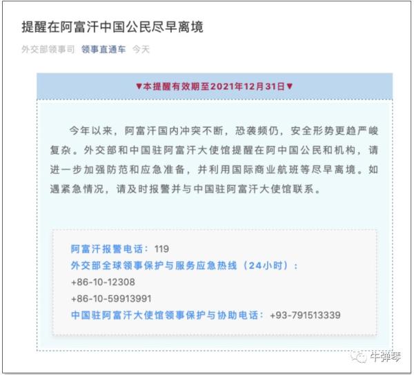 其实,之前的5月27日,中国驻阿富汗大使馆已发布了类似的警告,强调中国在阿公民和机构,“如非必要,请尽快离阿”,而且,还多了这样一段话: