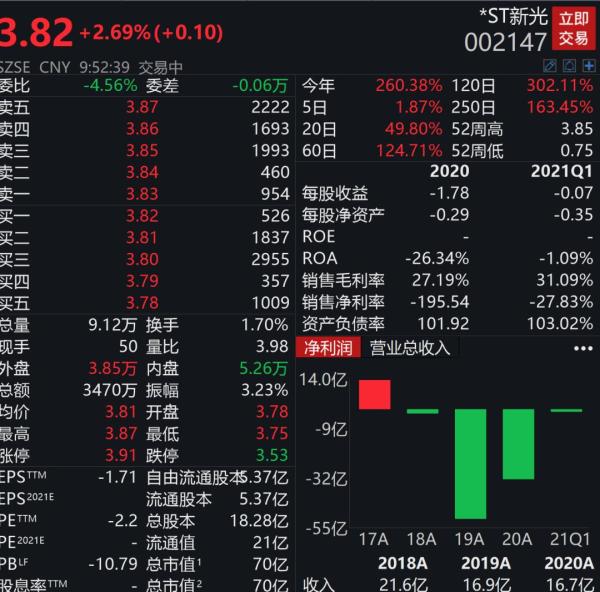 截至发稿,*st新光报3.82元/股,总市值70亿元。
