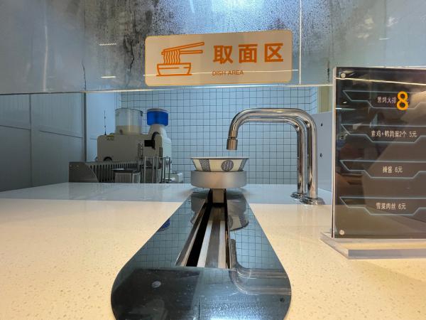 记者采访当天,杨阿姨给自己点了一碗大排汤面。在工作人员指导下,她把碗放置在取餐处,厨房中便传来轻轻的机器启动声,雪白的面条现场压制后落入沸水烹煮,由机器人倒入面碗后再倒入汤料。杨阿姨端起盛着清汤面的餐盘,挑选了一块葱烤大排作为浇头,紧接着就一步挪位到旁边的支付区,可以刷敬老卡,也可以刷支付宝、微信、数字人民币或现金付款。