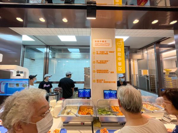 在自助中餐区,透过玻璃窗能看到无人厨房内的场景:蔬菜从机器上方传输下来,进入机器内部,黄色的机械臂此时开始烹饪,通过严格控制菜量、份数、油盐糖的摄取,保证菜品不仅口味一致,并且所含的能量、脂肪也能恒定。不过,由于模式较为新颖,居民取餐时仍由工作人员帮忙,未来将引入“机械臂打菜”等技术。