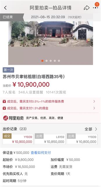 “于买家而言,性价比很高。”此次拍卖的处置单位是浙江世贸拍卖中心,公司总经理单敏强算了笔账,按建筑面积算,房屋成交价每平方米7万多元,“在苏州的中心地段,一般别墅成交价每平方米要20多万元;在杭州,这套房子估计值半个亿。”拍卖信息显示,这处宅院市场估价1680万元,拍卖成交价不及预期。