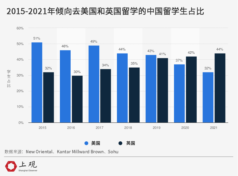 赴美留学热度的下降并不是一蹴而就的。据统计,2015年倾向去美国留学的中国留学生占比为51%,而到了2021年,这一比重下降至32%。相反,倾向前往英国留学的人数增加,从2015年的32%,上涨至2021年的44%。