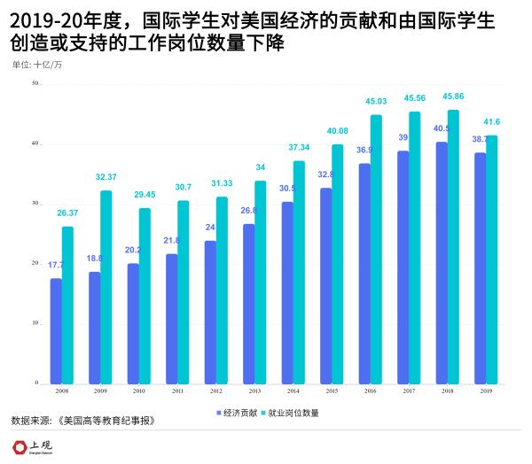 而2020年留学政策收紧后,留学产业遭受冲击。据nafsa(国际教育工作者协会)数据显示,2019至2020学年,国际学生对美国经济的贡献为387亿美元,同比下降了18亿,降幅为4.4%,为近20年来留学经济数据的首次下降。