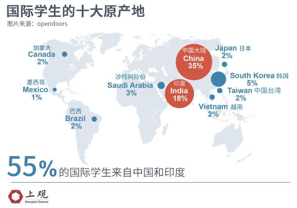 中国是美国国际学生的主要来源国。2019-2020学年,有37.2万中国大陆学生在美国大学学习,占国际学生总数的35%,几乎是第二大来源国印度学生的两倍。
