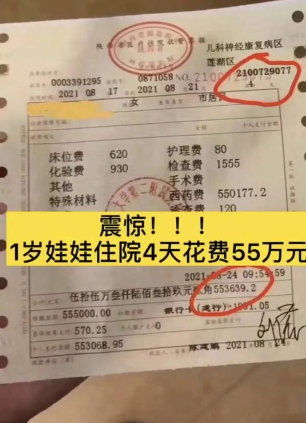 近日,网传一西安交通大学附属第二医院儿科神经康复病区住院收费票据显示,一名1岁幼女从今年8月17日开始,住院4天直到8月21日,花费55万元。其中床位费620元,化验费930元,护理费80元,检查费1555元,诊查费120元,西药费550177.2元。不少网友表示“这真是天价医疗费”,还有网友说,“这种情况应该谁来监督?”