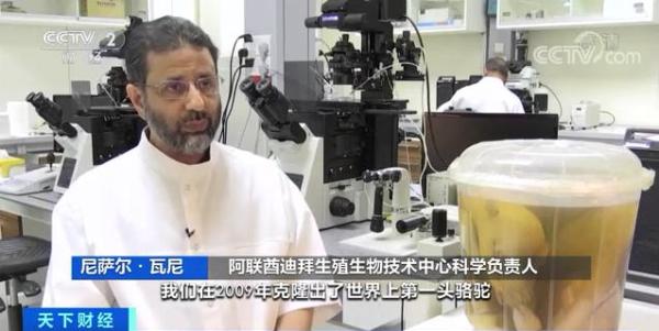 阿联酋迪拜生殖生物技术中心科学负责人 尼萨尔·瓦尼:我们在2009年克隆出世界上第一头骆驼,名叫因贾兹,目前我们每年克隆出大约10至20头骆驼幼崽,目前我们工作的重点是克隆骆驼,因为市场需求很大,以至于我们根本无法满足。