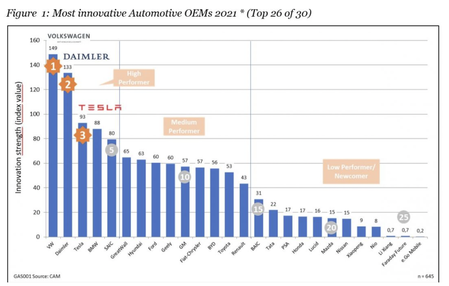 然而此次,榜单前十位首次出现三家中国车企。其中,上汽集团排在大众、奔驰、特斯拉和宝马之后,名列第五。这是2005年来,中国汽车制造商首次进入这份汽车界创新权威排名榜单的前5位。
