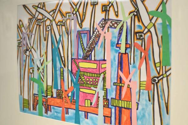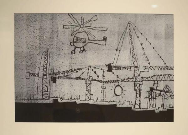 一等奖作品夏浚超的《车来车往》用几条粗粗的曲线横在画中央,竖竖的“直线”撑起层叠弯曲的高架,下面是密密麻麻的车辆,车辆跳跃的色彩让这张画看起来很童真。“如果把车去掉,弯曲的线条就是一幅抽象画了。”市群艺馆美术指导陈迪说。