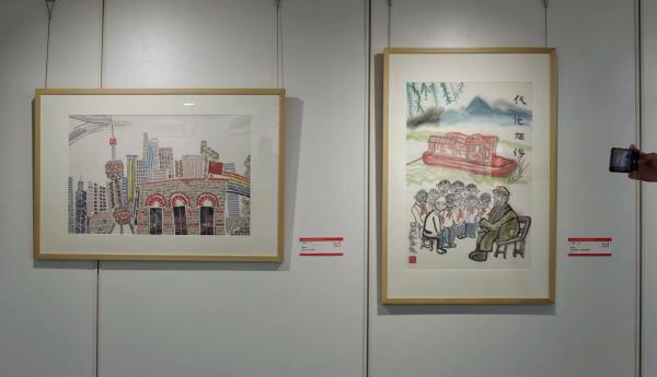 初一学生胡吴亦佳的水墨画《家乡小景》以自己去过的地方为基础,描绘内心的精神家园。她认为画画可以让自己静下心来,而画山水需要全局构图,也让自己的格局变大了。上小学的杜柏辰画了外滩建筑的景象,尽管才十岁,但讲起作品构思和近大远小的布局头头是道。“画画很有趣,我把它当作学习间隙的放松,当成快乐。”