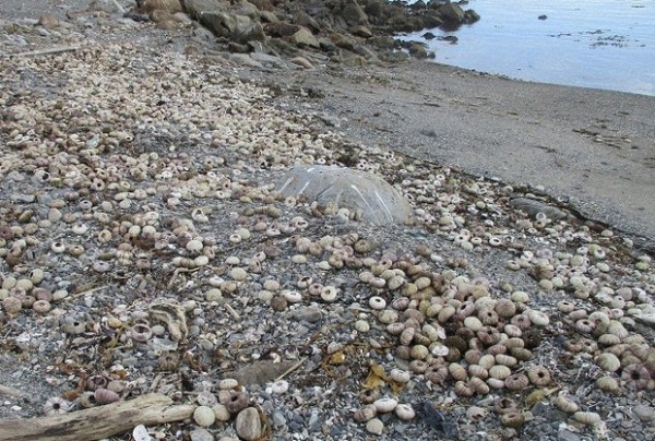 被冲上海岸的大量海胆尸骸(日媒9月27日北海道摄)