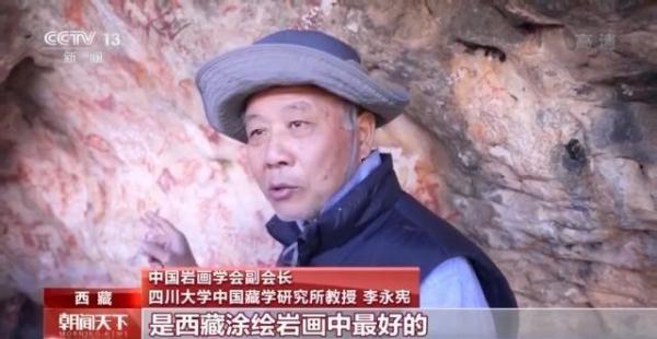 中国岩画学会副会长 四川大学中国藏学研究所教授 李永宪:反映的是狩猎,就是人和动物的互动,动物刻画非常生动,可以说在绘画水平上来讲的话,是西藏涂绘岩画中最好的。