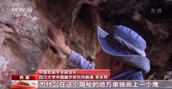 中国岩画学会副会长 四川大学中国藏学研究所教授 李永宪:出现频率很高就是鹰的形象,但是这个鹰已经不是单纯飞禽动物的姿态,它带有一定的人形已经高度符号化了。为什么在这个隐秘的地方单独画上一个鹰,它是有崇拜的作用在里面。