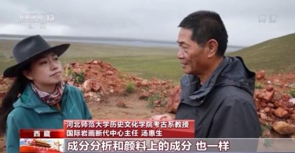 河北师范大学历史文化学院考古系教授 国际岩画断代中心主任 汤惠生:成分分析和颜料上的成分也一样,用水稀释了以后,用一些添加剂进行分析。如果一致就说明有可能是从这里采的。