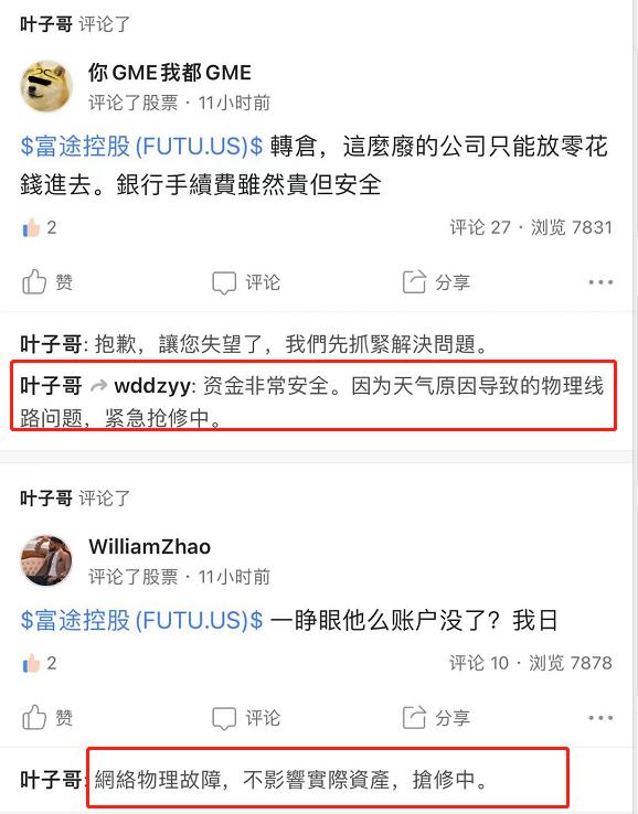 富途创始人李华“叶子哥”在牛牛圈回复称,是因为天气原因导致物理线路问题,实际资产不会被影响。