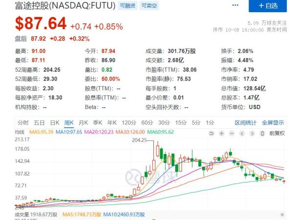 富途控股自2019年3月8日登陆美国纳斯达克,股价一度突破200美元,市值接近300亿美元。随着今年7月起中概股行情出现动荡,截至10月8日收盘,富途美股报收87.64美元,总市值128亿美元,折合人民币约824.77亿元。