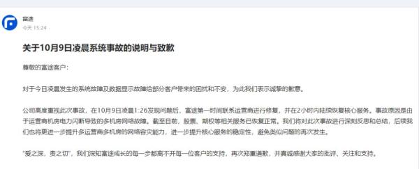 针对9日凌晨系统事故,富途发布声明表示,对于今日凌晨发生的系统故障及数据显示故障给部分客户带来的困扰和不安,为此我们表示诚挚的歉意。
