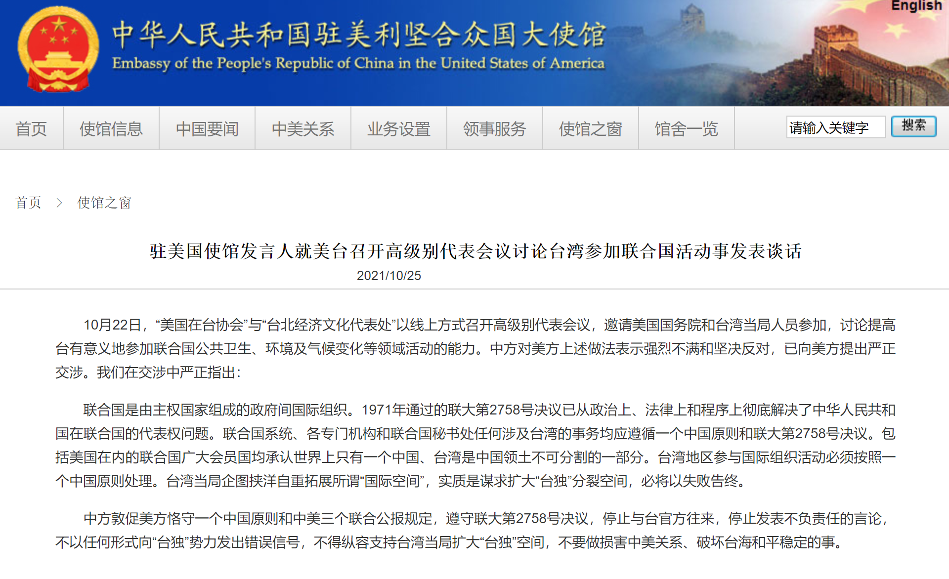 当地时间10月25日,中国驻美国使馆发言人就美台召开高级别代表会议讨论台湾参加联合国活动一事表示强烈不满和坚决反对,已向美方提出严正交涉。