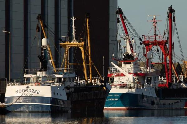 这是2020年10月11日在英国南部滨海肖勒姆拍摄的停靠在码头的渔船。滨海肖勒姆是英国政府指定的捕鱼港口之一。(新华社发,蒂姆·爱尔兰摄)