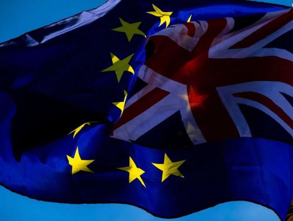这是2019年10月19日在英国伦敦议会大厦外拍摄的欧盟旗帜与英国国旗。(新华社记者 韩岩 摄)