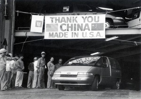 1993年,雪佛兰汽车从美国运抵天津港,美方人员打出“感谢你,中国”的横幅。新华社