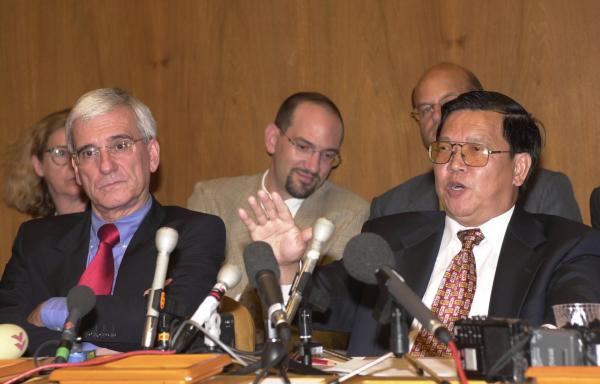 中国入世谈判结束后,龙永图和世贸组织中国组会议主席吉拉德出席记者招待会。新华社