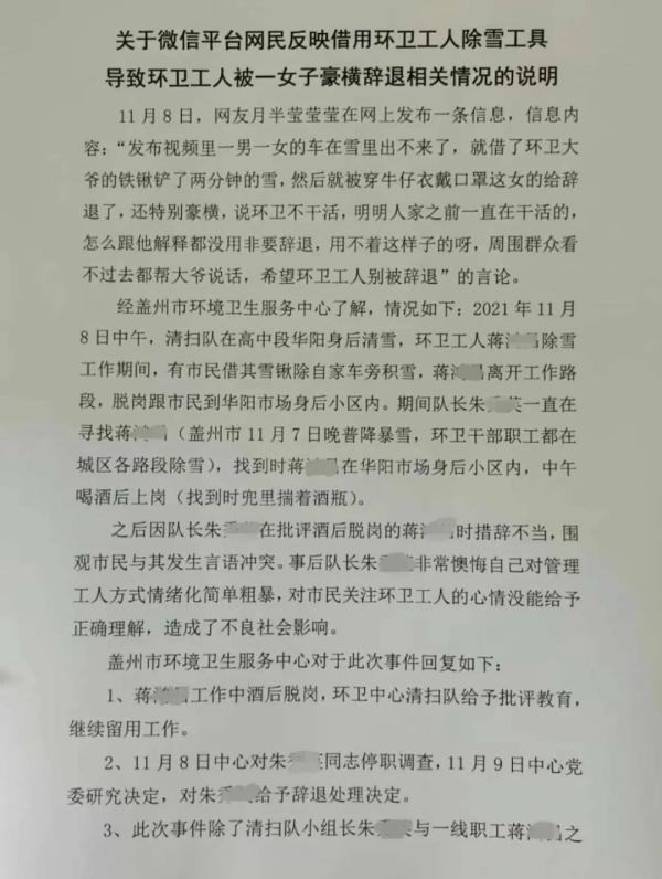 情况说明中称,经盖州市环境卫生服务中心了解,2021年11月8日中午,清扫队在高中段华阳身后清雪,环卫工人蒋某某除雪工作期间,有市民借其雪锹除自家车旁积雪,蒋某某离开工作路段,脱岗跟市民到华阳市场身后小区内。