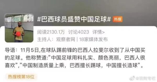 11月5日,在俱乐部球队踢前锋的巴西人拉斐尔收到了从中国买的足球。他称赞:“中国制造质量上乘,巴西擅长踢球,中国擅长造球”。
