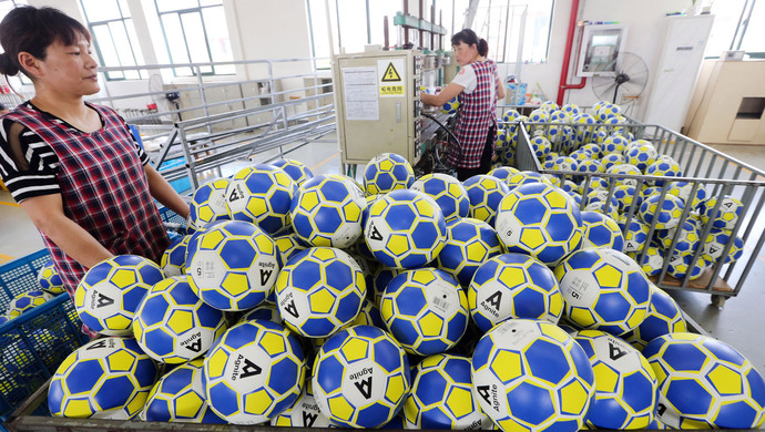 在广东东莞,自动化工厂每三分钟就能制造一个足球,巴西世界杯指定用球就是中国生产的。