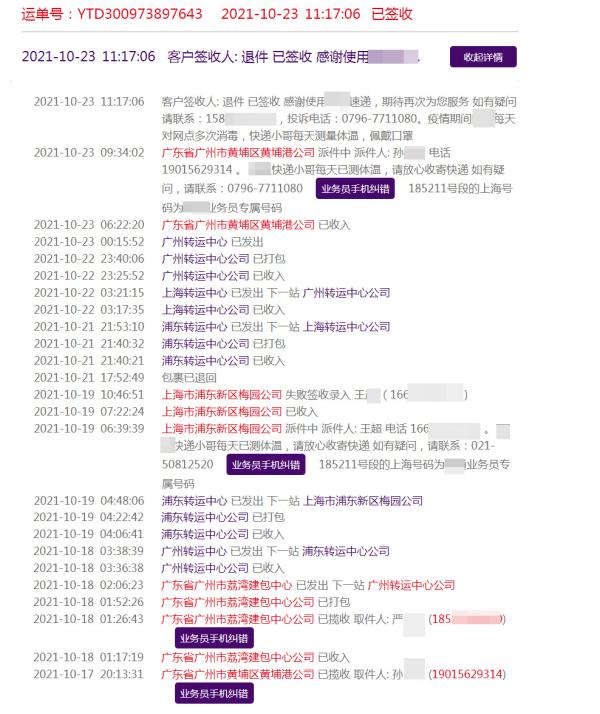 △“ytd300862360266”物流记录显示,快递同样为“广州市黄埔区黄埔港公司”网点所揽收。记者拨打揽件快递员孙某的电话,发现也是空号。